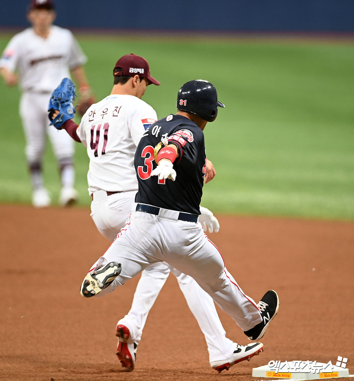 [엑스포츠뉴스 고척, 김한준 기자] 1일 오후 서울 구로구 고척스카이돔에서 열린 '2021 신한은행 SOL KBO리그' 롯데 자이언츠와 키움 히어로즈의 경기, 1회초 롯데 손아섭의 내야땅벌때 1루 베이스 커버를 들어간 키움 선발투수 안우진이 베이스를 밟고 있다.