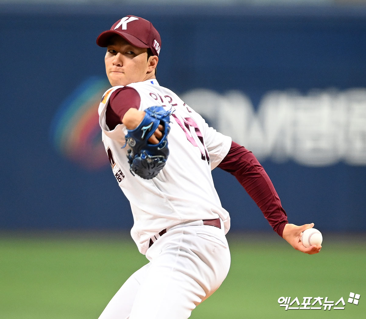 [엑스포츠뉴스 고척, 김한준 기자] 1일 오후 서울 구로구 고척스카이돔에서 열린 '2021 신한은행 SOL KBO리그' 롯데 자이언츠와 키움 히어로즈의 경기, 1회초 키움 선발투수 안우진이 공을 힘차게 던지고 있다.