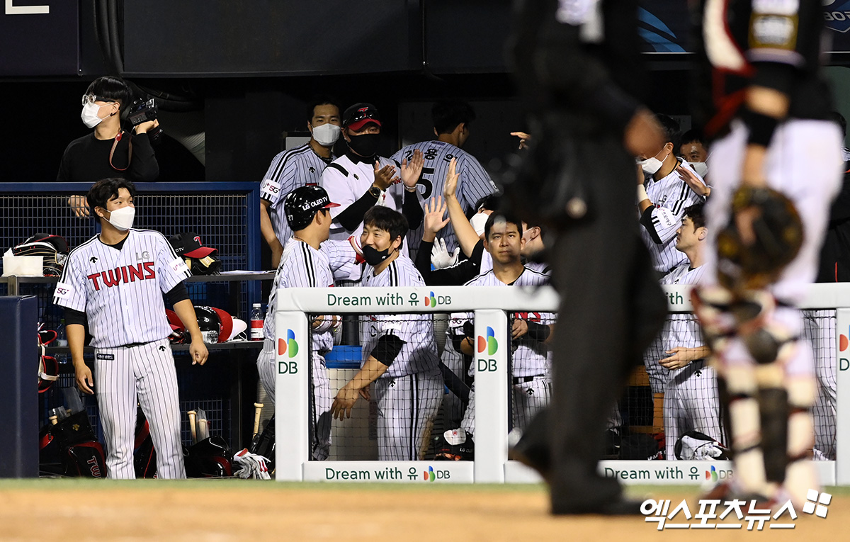 [엑스포츠뉴스 잠실, 고아라 기자] 2일 오후 서울 송파구 잠실야구장에서 열린  '2021 신한은행 SOL KBO리그' KT 위즈와 LG 트윈스의 경기, 8회말 1사 3루 유강남이 내야 땅볼로 득점한 후 더그아웃에서 축하를 받고 있다.