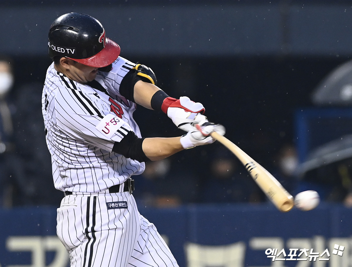 [엑스포츠뉴스 잠실, 고아라 기자] 10일 오후 서울 송파구 잠실야구장에서 열린 '2021 신한은행 SOL KBO리그' NC 다이노스와 LG 트윈스의 경기, 4회말 2사 1루 LG 김민성이 안타를 치고 있다.