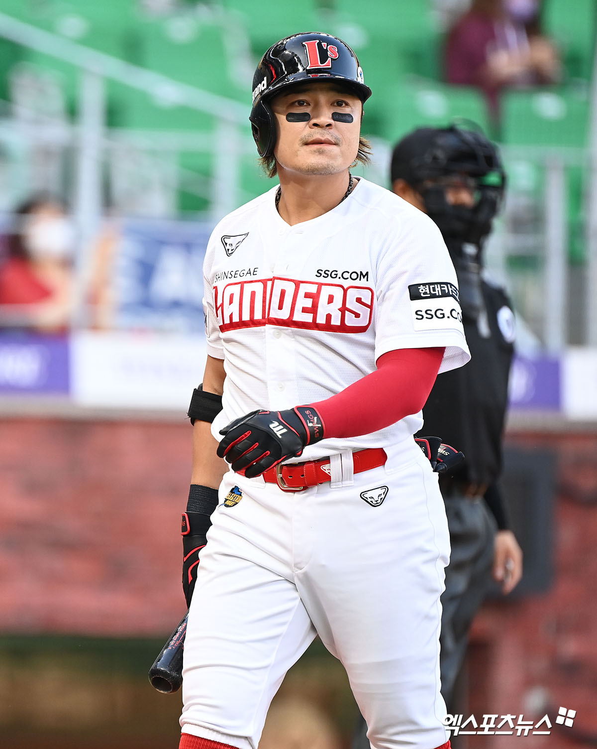 [엑스포츠뉴스 인천, 김한준 기자] 11일 오후 인천 SSG랜더스필드에서 열린 '2021 신한은행 SOL KBO리그' 키움 히어로즈와 SSG 랜더스의 경기, 1회말 무사 1,2루 SSG 추신수가 헛스윙 삼진을 당한 후 아쉬워하고 있다.