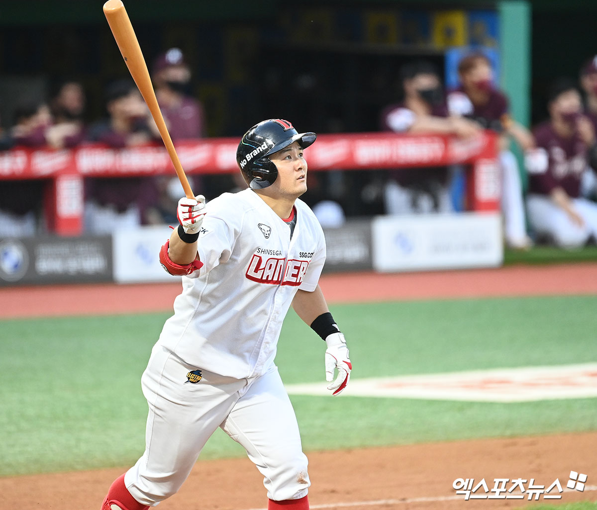 [엑스포츠뉴스 인천, 김한준 기자] 11일 오후 인천 SSG랜더스필드에서 열린 '2021 신한은행 SOL KBO리그' 키움 히어로즈와 SSG 랜더스의 경기, 3회말 2사 SSG 최주환이 솔로 홈런을 날리고 있다.