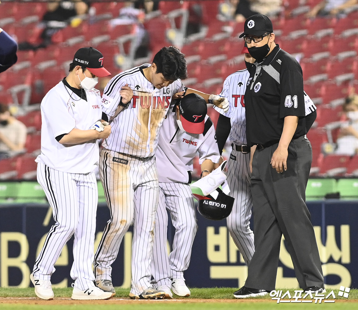 [엑스포츠뉴스 잠실, 고아라 기자] 11일 오후 서울 송파구 잠실야구장에서 열린 '2021 신한은행 SOL KBO리그' 두산 베어스와 LG 트윈스의 경기, 6회말 1사 LG 문보경이 내야땅볼을 치고 1루로 달리다 부상으로 교체되고 있다.