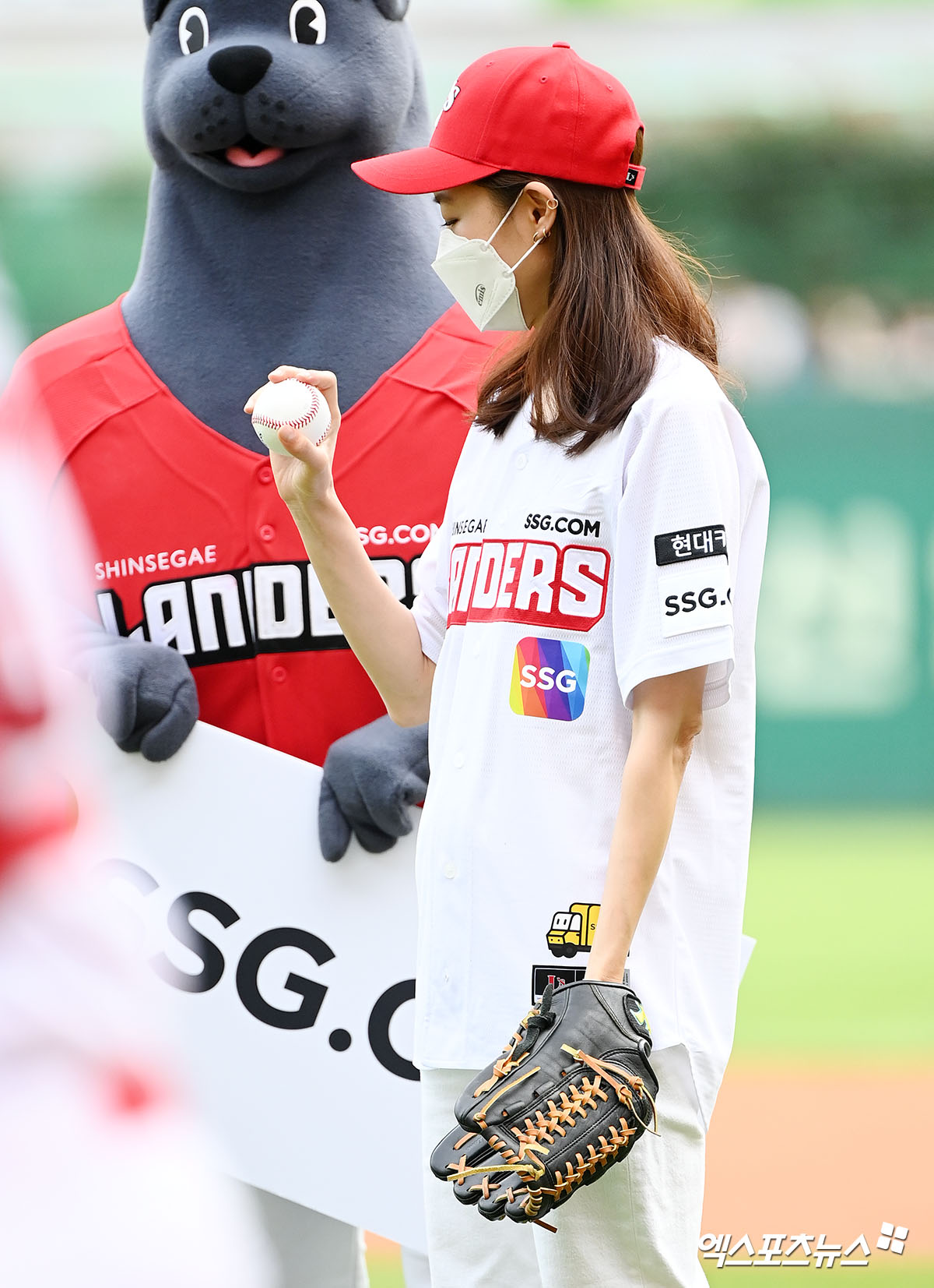 [엑스포츠뉴스 인천, 김한준 기자] 12일 오후 인천 SSG랜더스필드에서 열린 '2021 신한은행 SOL KBO리그' 키움 히어로즈와 SSG 랜더스의 경기, 경기 전 배우 공효진이 시구에 임하고 있다.