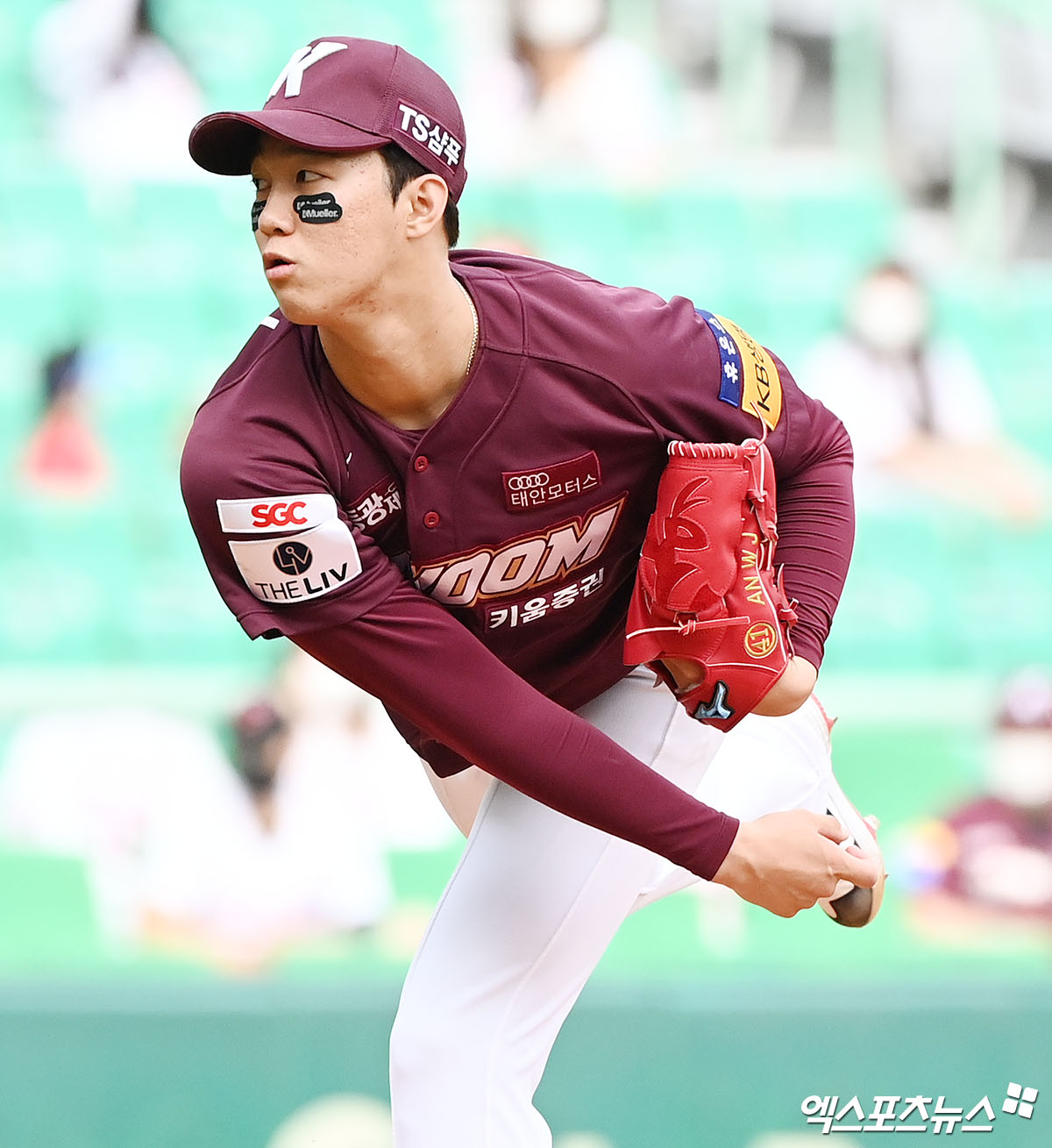 [엑스포츠뉴스 인천, 김한준 기자] 12일 오후 인천 SSG랜더스필드에서 열린 '2021 신한은행 SOL KBO리그' 키움 히어로즈와 SSG 랜더스의 경기, 1회말 키움 선발투수 안우진이 공을 힘차게 던지고 있다.