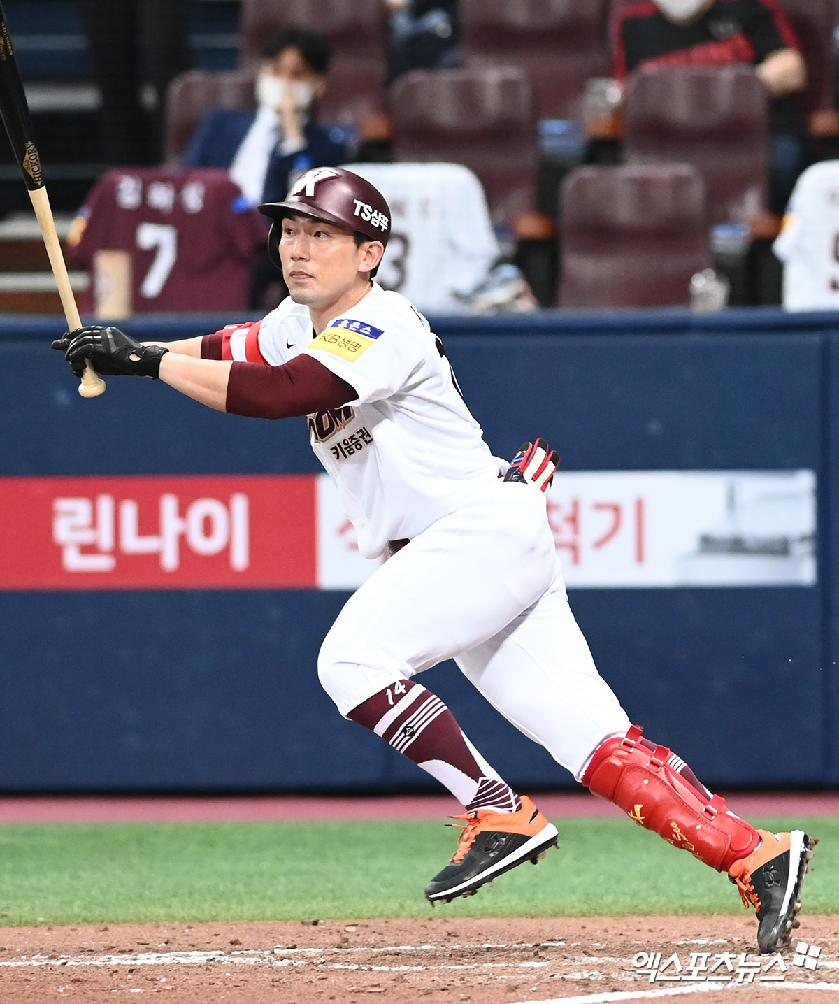 [엑스포츠뉴스 고척, 고아라 기자] 15일 오후 서울 구로구 고척스카이돔에서 열린 '2021 신한은행 SOL KBO리그' LG 트윈스와 키움 히어로즈의 경기, 5회말 1사 키움 서건창이 1루타를 날리고 있다.