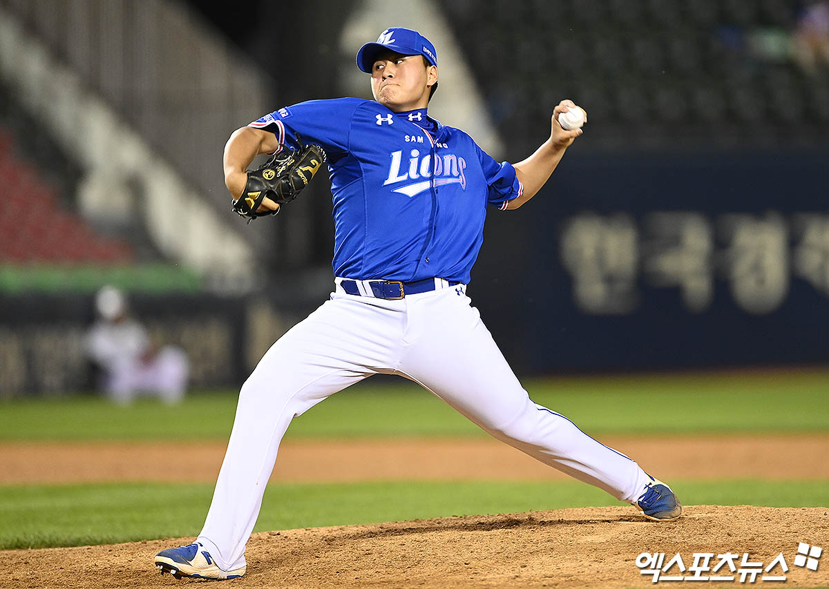 [엑스포츠뉴스 잠실, 박지영 기자] 15일 오후 서울 송파구 잠실야구장에서 열린 '2021 신한은행 SOL KBO리그' 삼성 라이온즈와 두산 베어스의 경기, 5회말 2사 만루 삼성 이승현이 역투하고 있다.
