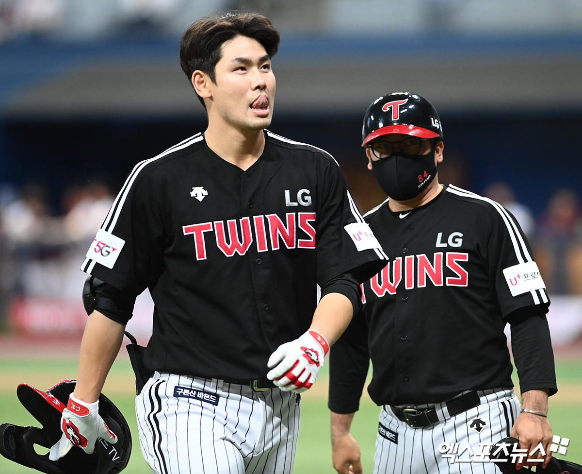 [엑스포츠뉴스 고척, 고아라 기자] 15일 오후 서울 구로구 고척스카이돔에서 열린 '2021 신한은행 SOL KBO리그' LG 트윈스와 키움 히어로즈의 경기, 9회초 2사 만루 LG 홍창기가 2타점 1루타를 날리고 더그아웃으로 들어오고 있다.