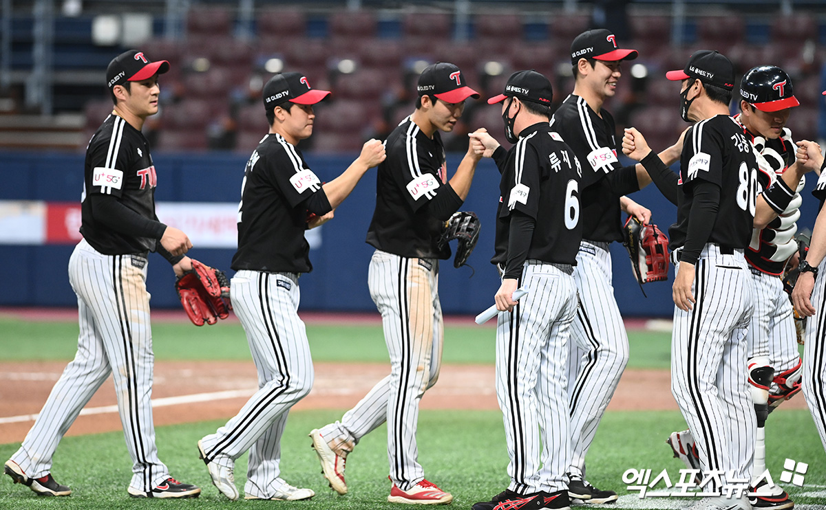 이날 경기에서 승리한 LG 선수단이 기뻐하고 있다.
