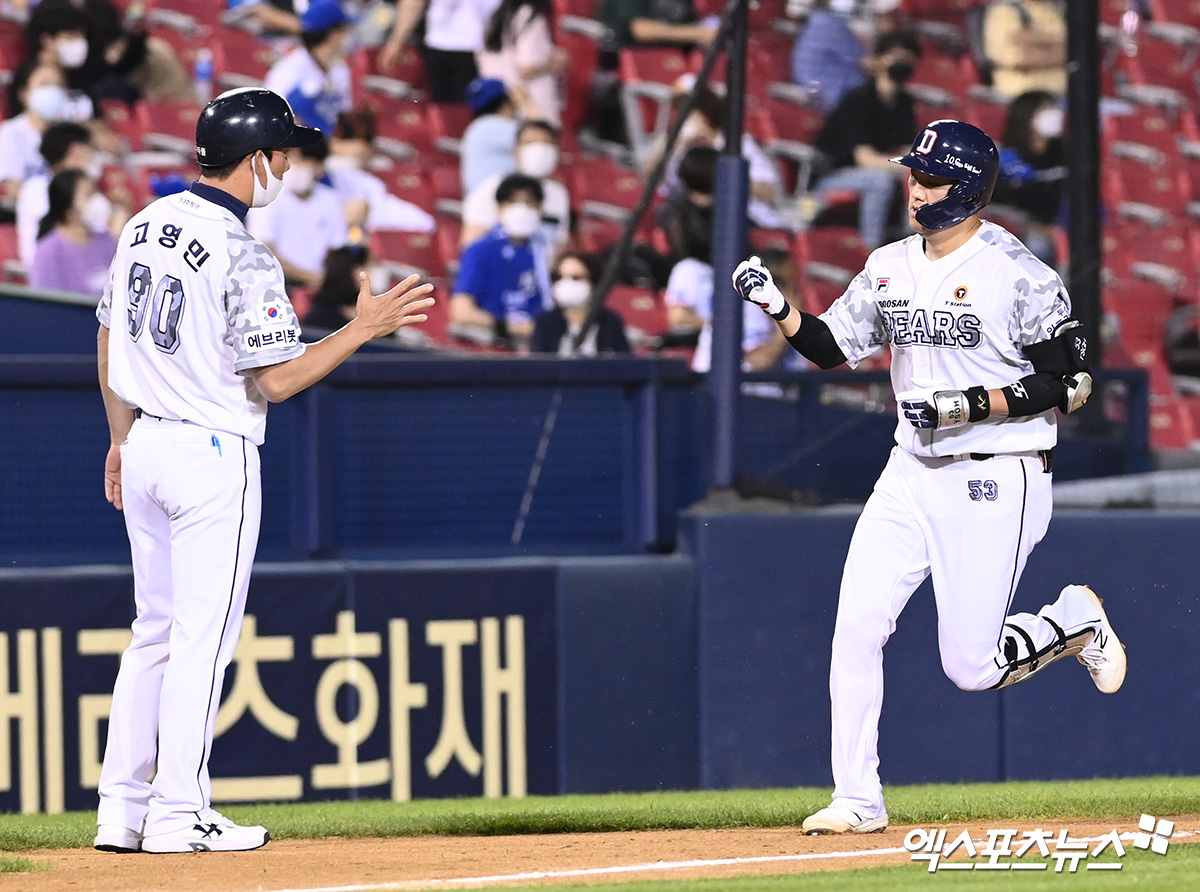 [엑스포츠뉴스 잠실, 고아라 기자] 16일 오후 서울 송파구 잠실야구장에서 열린 '2021 신한은행 SOL KBO리그' 삼성 라이온즈와 두산 베어스의 경기, 7회말 두산 양석환이 솔로포를 날린 후 그라운드를 돌며 세리머니를 하고 있다.