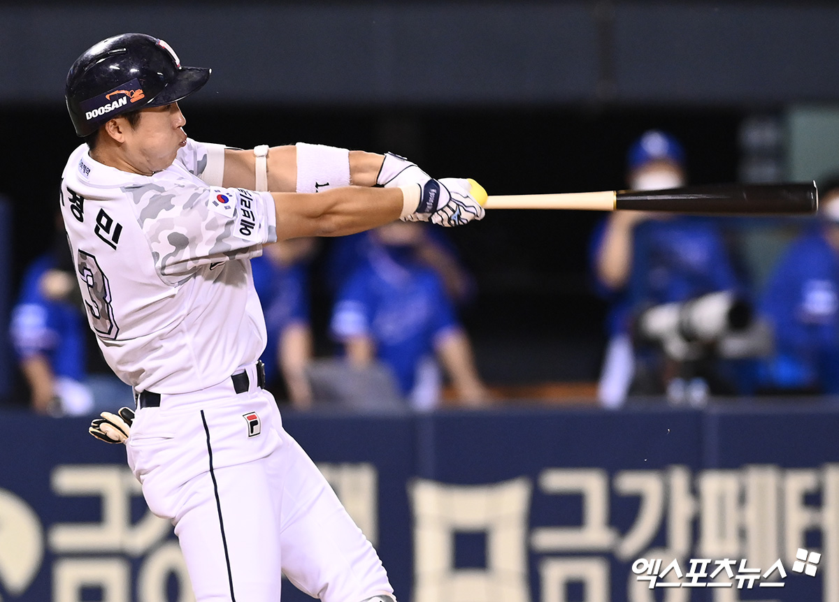 [엑스포츠뉴스 잠실, 고아라 기자] 16일 오후 서울 송파구 잠실야구장에서 열린 '2021 신한은행 SOL KBO리그' 삼성 라이온즈와 두산 베어스의 경기, 7회말 무사 두산 허경민이 1루타를 날리고 있다.