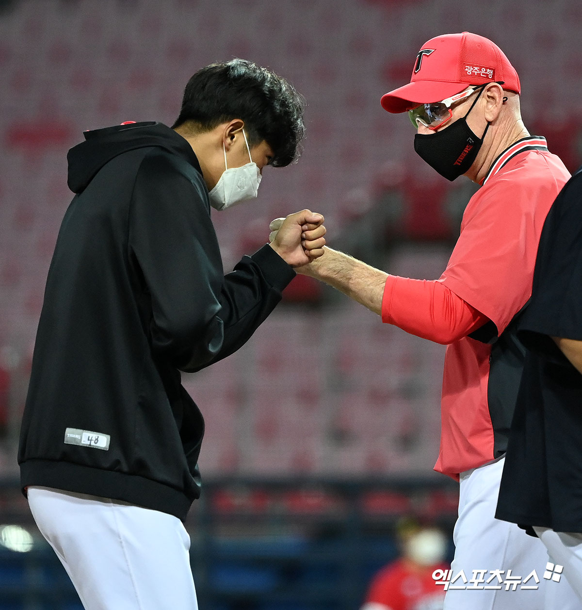 이날 경기에서 승리한 KIA 윌리엄스 감독이 이의리와 함꼐 기쁨을 나누고 있다.