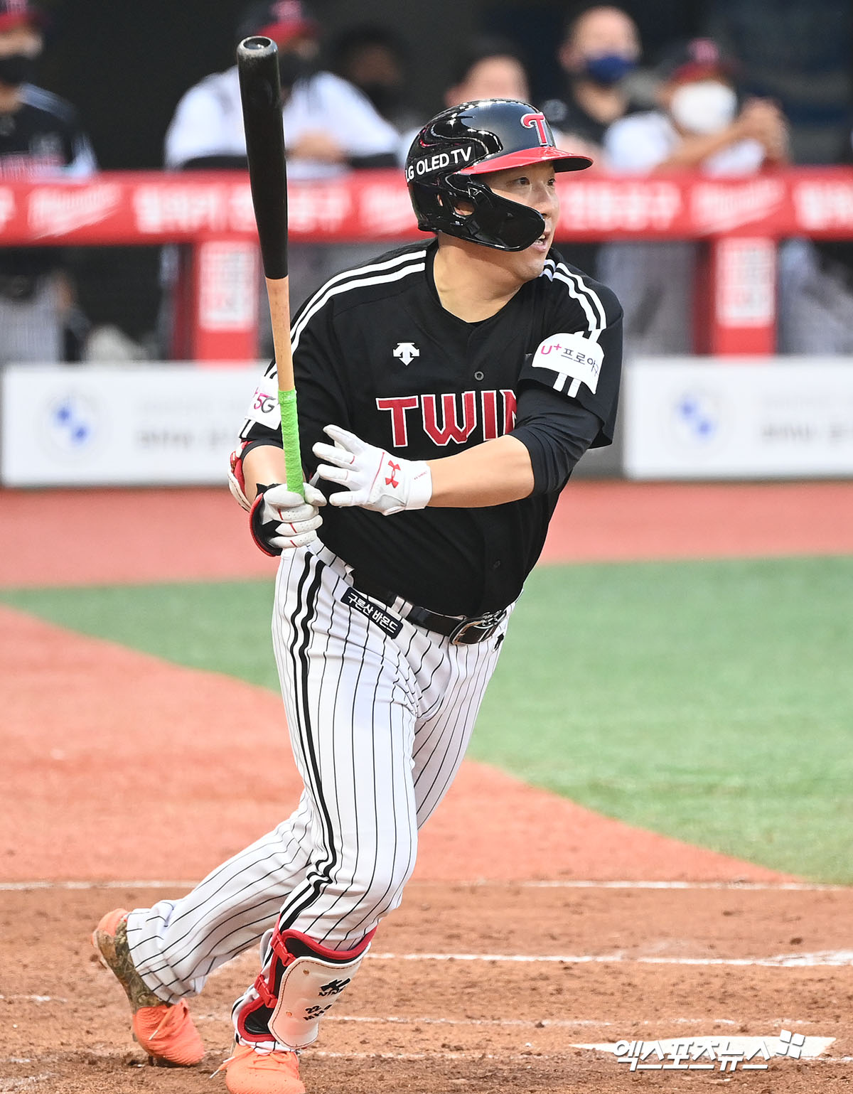 [엑스포츠뉴스 인천, 김한준 기자] 24일 오후 인천 SSG랜더스필드에서 열린 '2021 신한은행 SOL KBO리그' LG 트윈스와 SSG 랜더스의 경기, 3회초 1사 1루 LG 김현수가 1타점 2루타를 날리고 있다.
