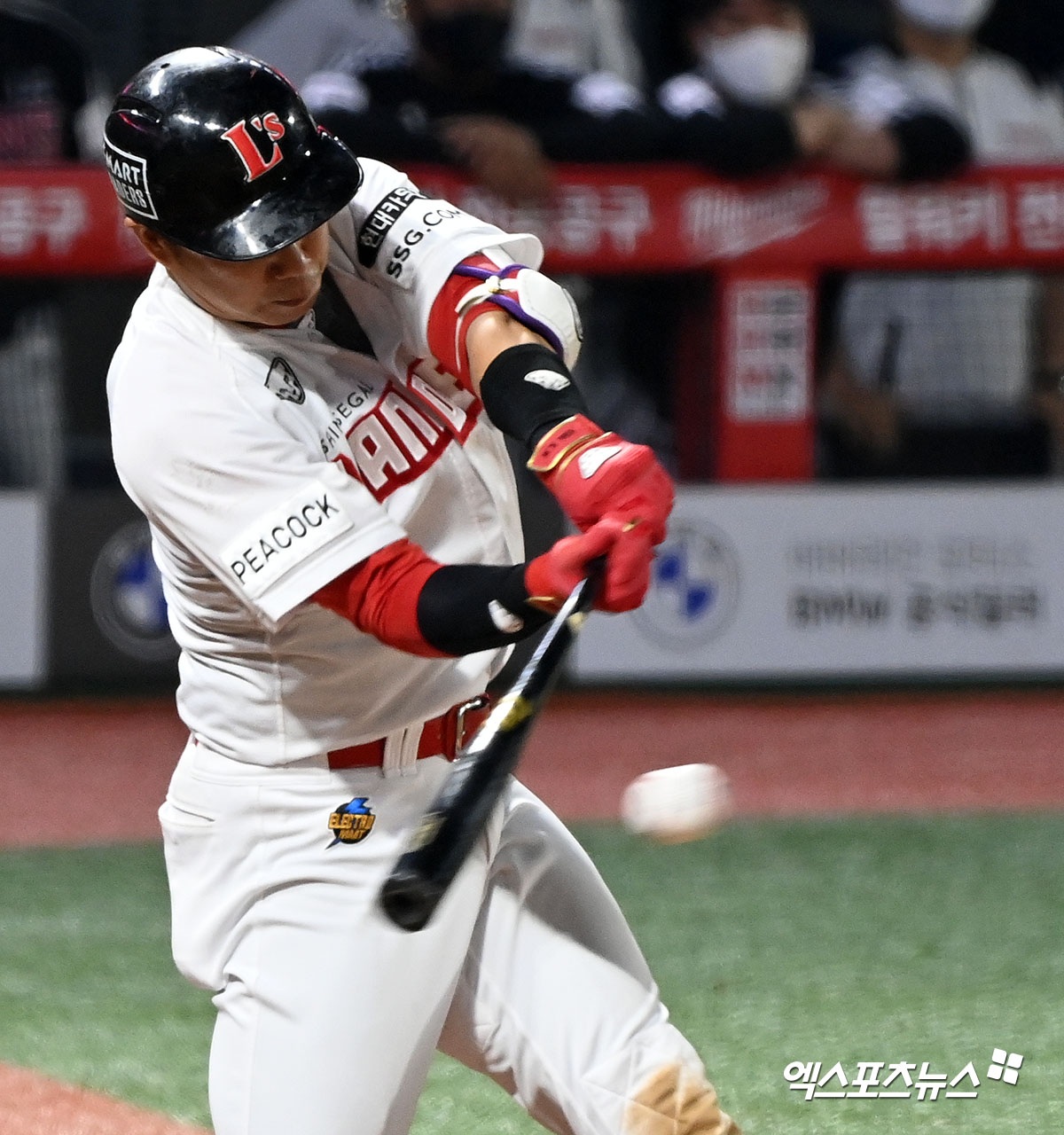 [엑스포츠뉴스 인천, 김한준 기자] 24일 오후 인천 SSG랜더스필드에서 열린 '2021 신한은행 SOL KBO리그' LG 트윈스와 SSG 랜더스의 경기, 8회말 1사 1,2루 SSG 김강민이 1타점 2루타를 날리고 있다.