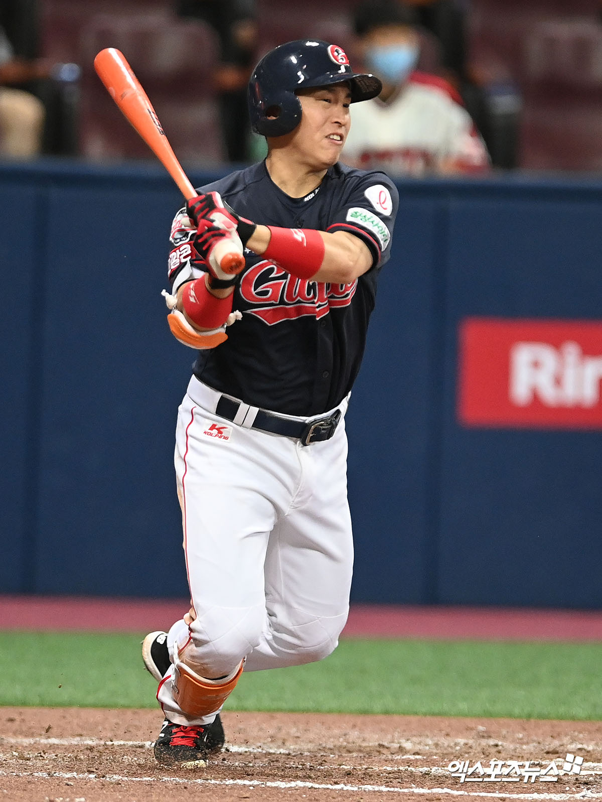 (엑스포츠뉴스 고척, 김한준 기자) 29일 오후 서울 구로구 고척스카이돔에서 열린 '2021 신한은행 SOL KBO리그' 롯데 자이언츠와 키움 히어로즈의 경기, 5회초 1사 1,2루 롯네 손아섭이 1타점 적시타를 날리고 있다.