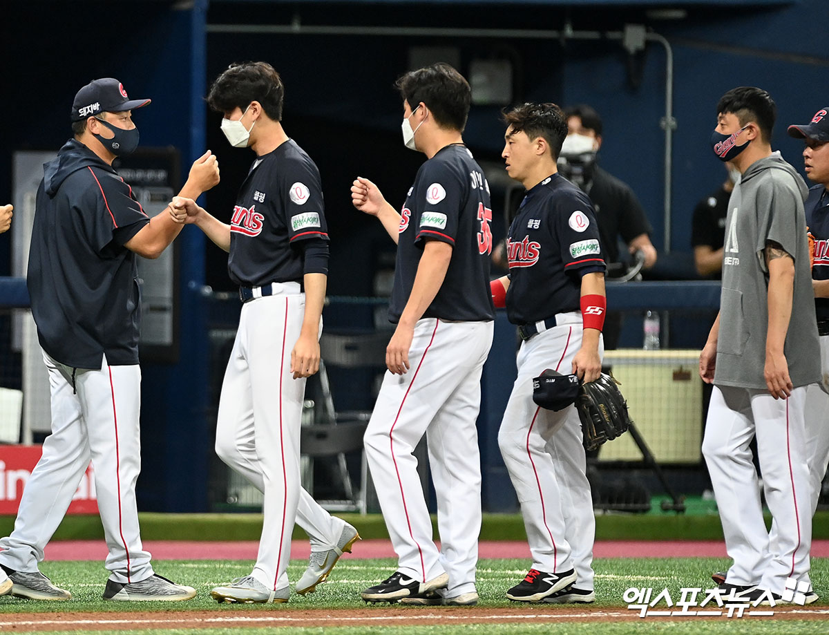 이날 경기에서 승리한 롯데 최현 감독대행이 선수들과 함께 기뻐하고 있다.