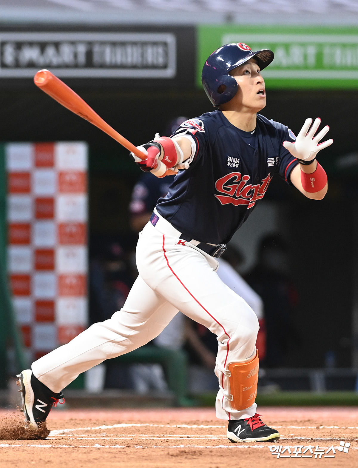 (엑스포츠뉴스 인천, 고아라 기자) 2일 오후 인천 SSG랜더스필드에서 열린 '2021 신한은행 SOL KBO리그' 롯데 자이언츠와 SSG 랜더스의 경기, 6회초 1사 롯데 손아섭이 2루타를 날리고 있다.