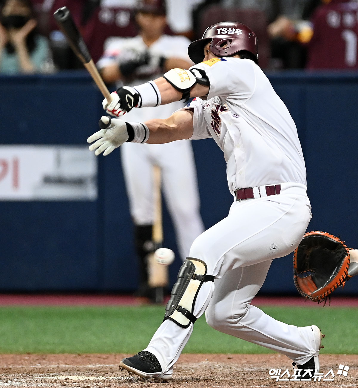 (엑스포츠뉴스 고척, 김한준 기자) 8일 오후 서울 구로구 고척스카이돔에서 열린 '2021 신한은행 SOL KBO리그' SSG 랜더스와 키움 히어로즈의 경기, 9회말 1사 만루 키움 박동원이 헛스윙 삼진을 당하고 있다.
