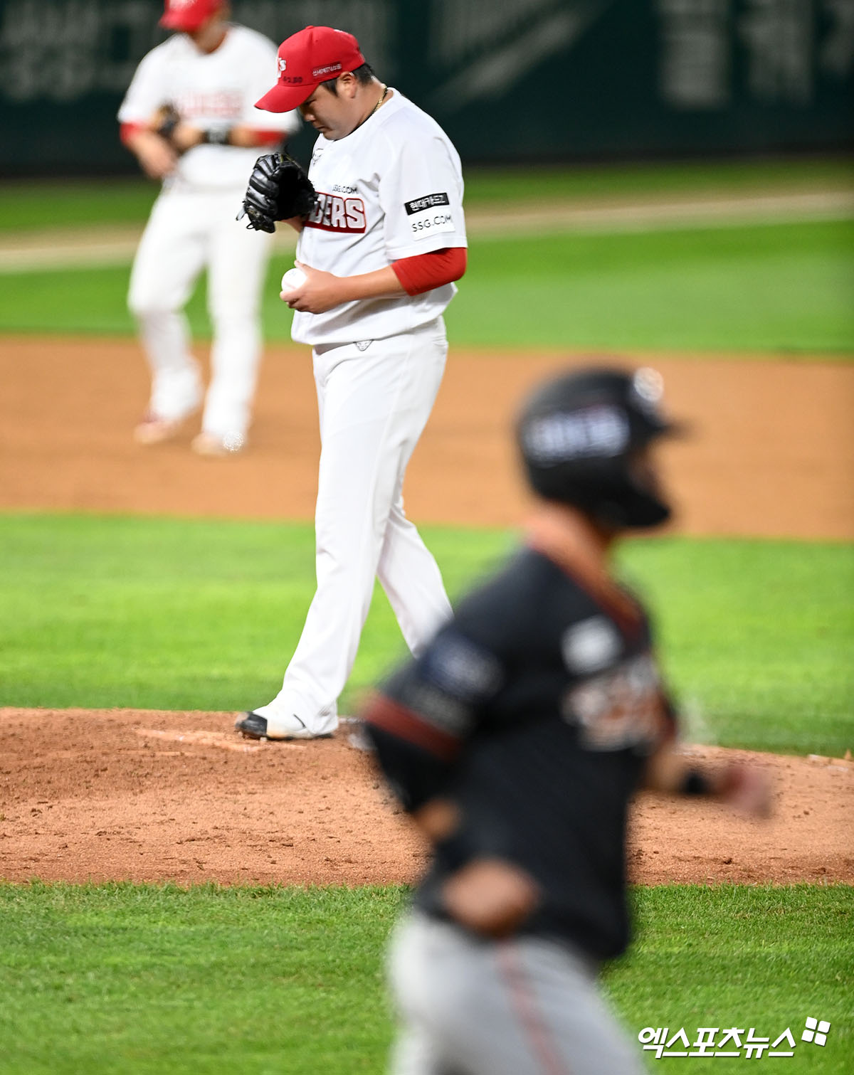 [엑스포츠뉴스 인천, 김한준 기자] 9일 오후 인천 SSG랜더스필드에서 열린 '2021 신한은행 SOL KBO리그' 한화 이글스와 SSG 랜더스의 경기, 7회말 1사 1,2루 SSG 김태훈이 한화 이도윤에게 볼넷을 허용한 후 아쉬워하고 있다.