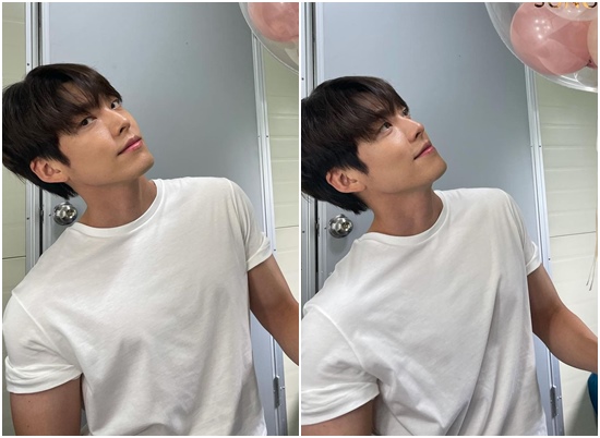 공개된 사진 속 김우빈은 풍선을 손에 들고 카메라를 보고 잔망스러운 표정을 하고 있다.