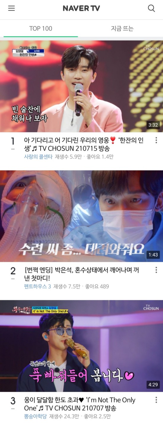 17일 오전 7시 기준, 임영웅이 주인공인 “기다리고 어 기다린 우리의 영웅 ‘한잔의 인생’ TV CHOSUN 210715 방송” 영상과 “웅이 달달함 한도 초과 ‘I’m Not The Only One’ TV CHOSUN 210707 방송” 콘텐츠가 1, 3위를 차지했다.