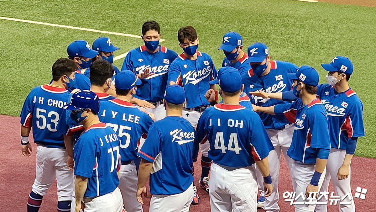 (엑스포츠뉴스 고척, 김한준 기자) 23일 오후 서울 구로구 고척스카이돔에서 열린 야구대표팀과 상무의 평가전 경기, 경기 전 야구대표팀 선수들이 파이팅을 하고 있다.