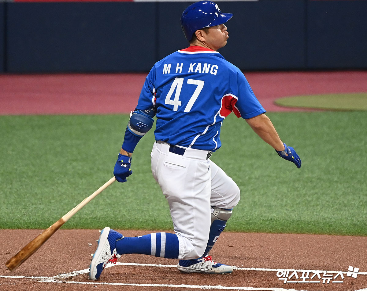 (엑스포츠뉴스 고척, 김한준 기자) 23일 오후 서울 구로구 고척스카이돔에서 열린 야구대표팀과 상무의 평가전 경기, 1회초 2사 1,3루 대한민국 강민호가 타격을 하고 있다.