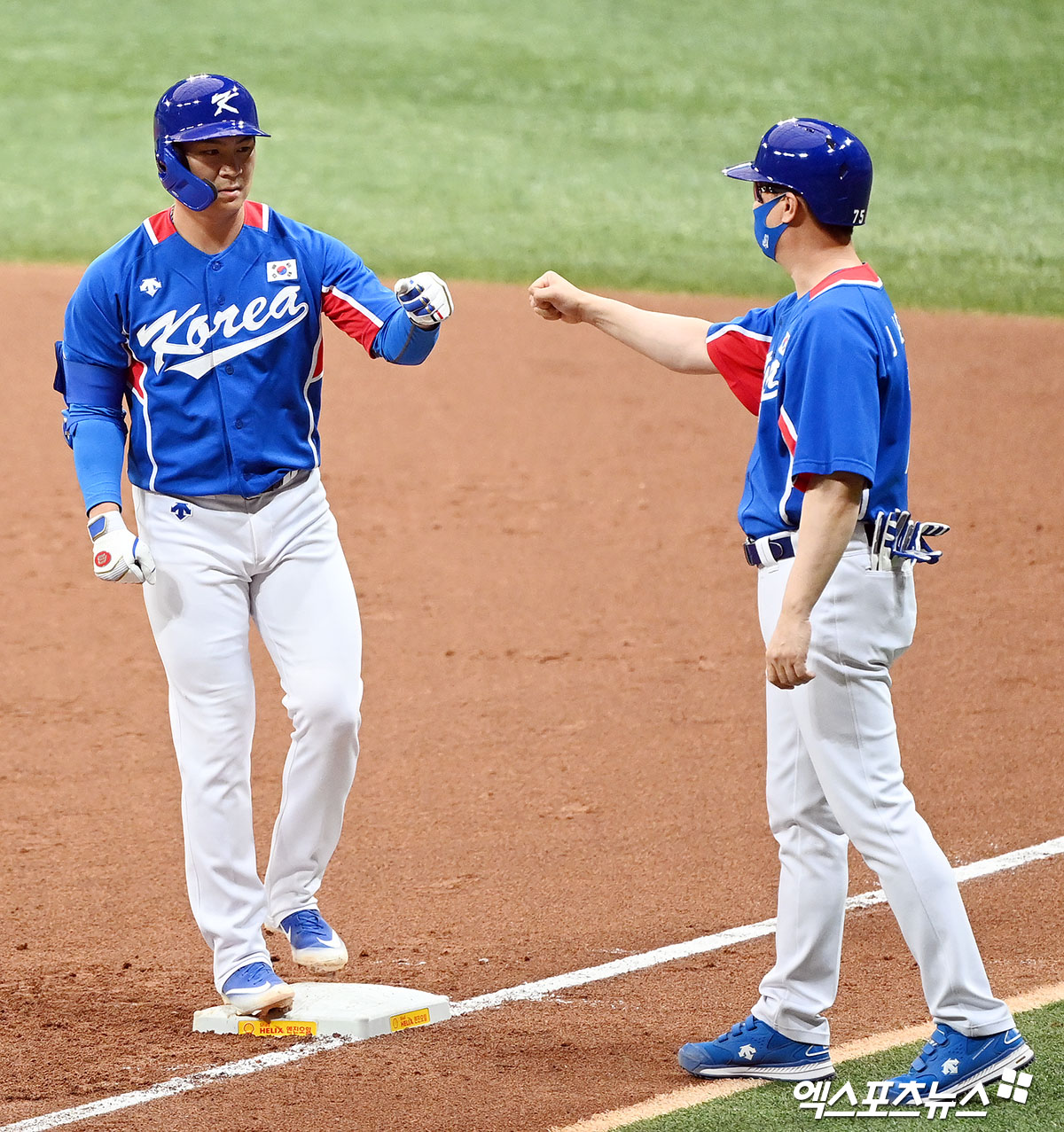 (엑스포츠뉴스 고척, 김한준 기자) 25일 오후 서울 구로구 고척스카이돔에서 열린 야구대표팀과 키움의 평가전 경기, 2회초 1사 1루 대한민국 오지환이 우전안타를 날린 후 귀루하고 있다.