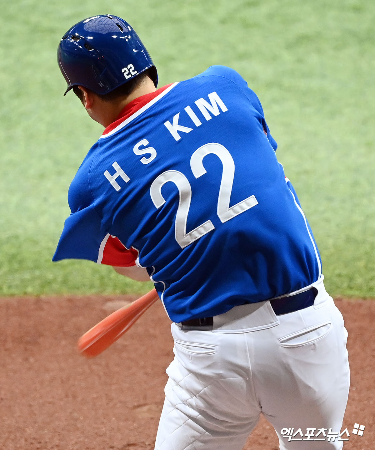 (엑스포츠뉴스 고척, 김한준 기자) 25일 오후 서울 구로구 고척스카이돔에서 열린 야구대표팀과 키움의 평가전 경기, 3회초 2사 대한민국 김현수가 타격을 하고 있다. 결과는 우익수 플라이 아웃.