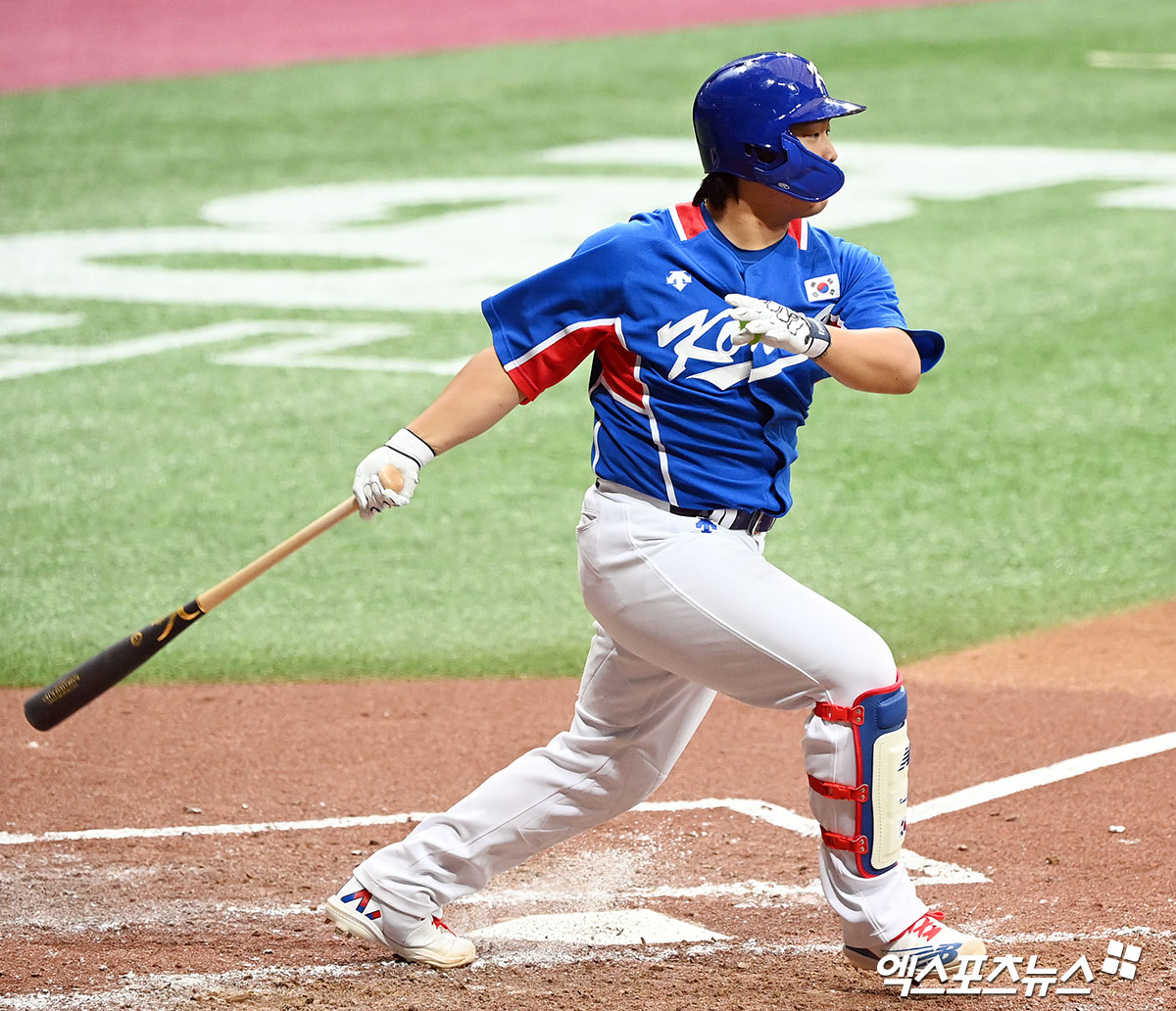 (엑스포츠뉴스 고척, 김한준 기자) 25일 오후 서울 구로구 고척스카이돔에서 열린 야구대표팀과 키움의 평가전 경기, 5회초 1사 만루 대한민국 강백호가 타격을 하고 있다. 결과는 병살타 아웃.