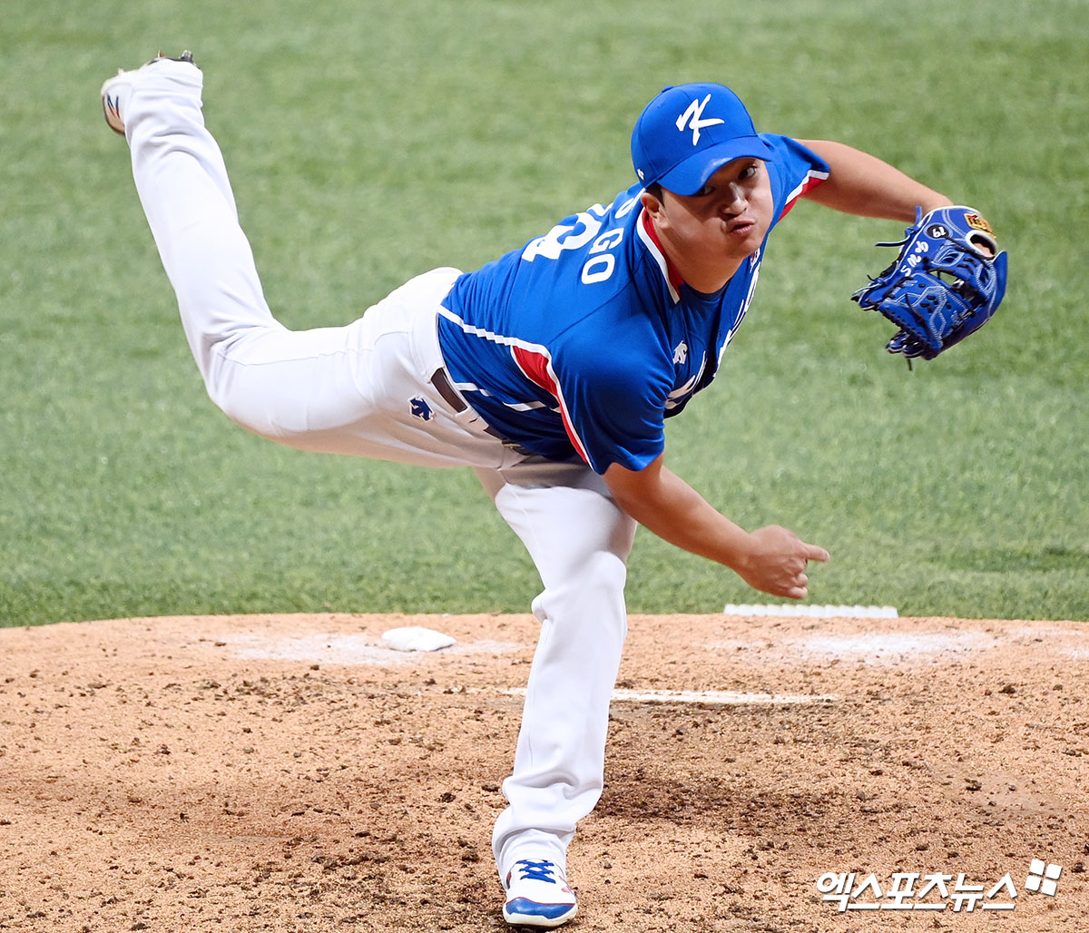 (엑스포츠뉴스 고척, 김한준 기자) 25일 오후 서울 구로구 고척스카이돔에서 열린 야구대표팀과 키움의 평가전 경기, 7회말 1사 대한민국 고우석이 공을 힘차게 던지고 있다.