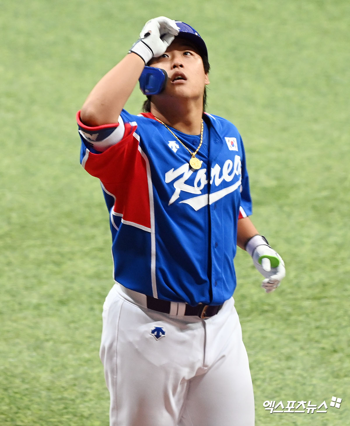(엑스포츠뉴스 고척, 김한준 기자) 25일 오후 서울 구로구 고척스카이돔에서 열린 야구대표팀과 키움의 평가전 경기, 8회초 1사 대한민국 강백호가 솔로 홈런을 날린 후 세리머니를 하고 있다.