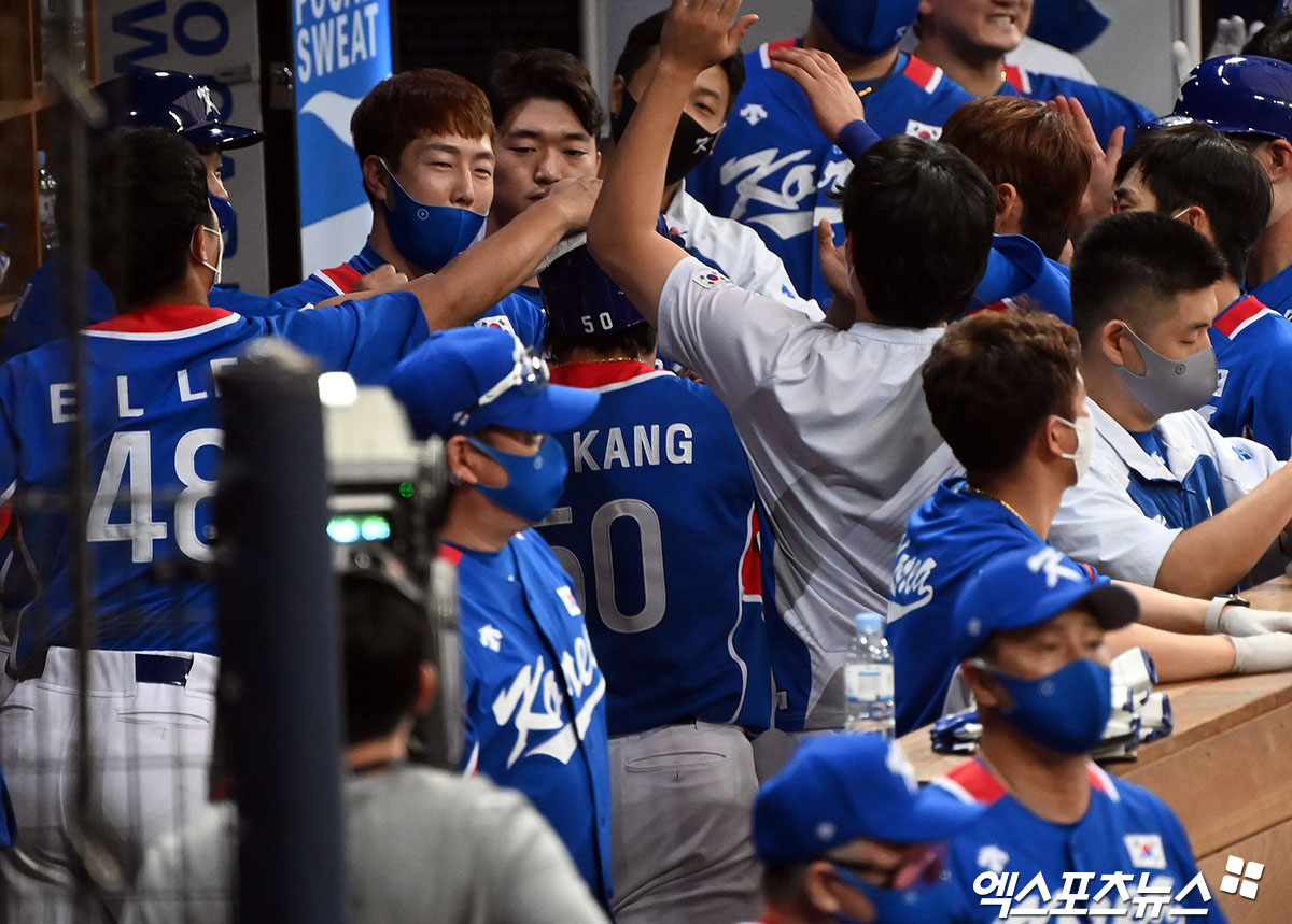 (엑스포츠뉴스 고척, 김한준 기자) 25일 오후 서울 구로구 고척스카이돔에서 열린 야구대표팀과 키움의 평가전 경기, 8회초 1사 대한민국 강백호가 솔로 홈런을 날린 후 더그아웃에서 축하를 받고 있다.