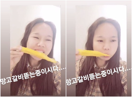 공개된 영상에는 망고를 갈비처럼 뜯고 있는 홍현희의 모습과 함께 "망고 갈비 뜯는 중이시다"라는 글이 담겼다.