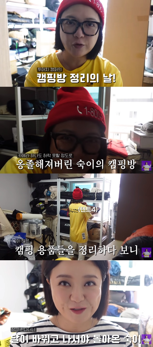 이날 김숙은 "캠핑방 정리해보도록 하겠습니다"라며 의욕을 불태웠다. 방 청소 결심의 이유에 대해 김숙은 "짐을 챙겨서 나가야 하는데 복잡하더라. 물건을 찾는데 시간이 좀 오래 걸린다. 며칠이 걸릴지 모르겠다"라고 설명했다.