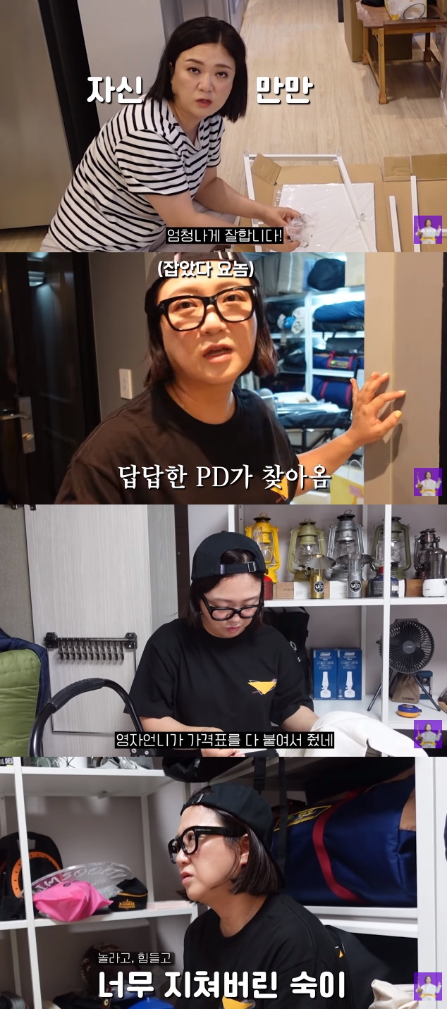 이어 김숙은 5개의 캠핑 침구류, 4개의 텐트 등 엄청난 양의 물건들을 정리했고 지친 듯 "잠깐 쉬자"라며 힘겨워했다.