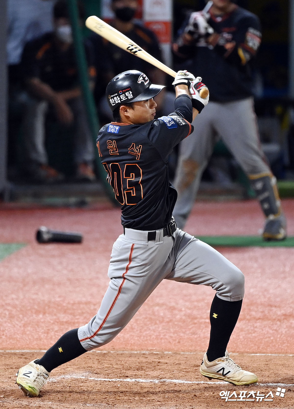 (엑스포츠뉴스 인천, 김한준 기자) 6일 오후 인천SSG랜더스필드에서 열린 한화 이글스와 SSG 랜더스의 퓨처스 경기, 9회초 무사 1루 한화 이원석이 타격을 하고 있다. 결과는 중견수 플라이 아웃.