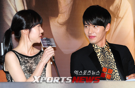 [엑스포츠뉴스 = 권태완 기자] 20일 오후 서울 동대문 메가박스에서 열린 영화 '사랑한다 사랑하지 않는다' 제작보고회에서 임수정(왼쪽)과 현빈이 질의응답을 하고 있다.
