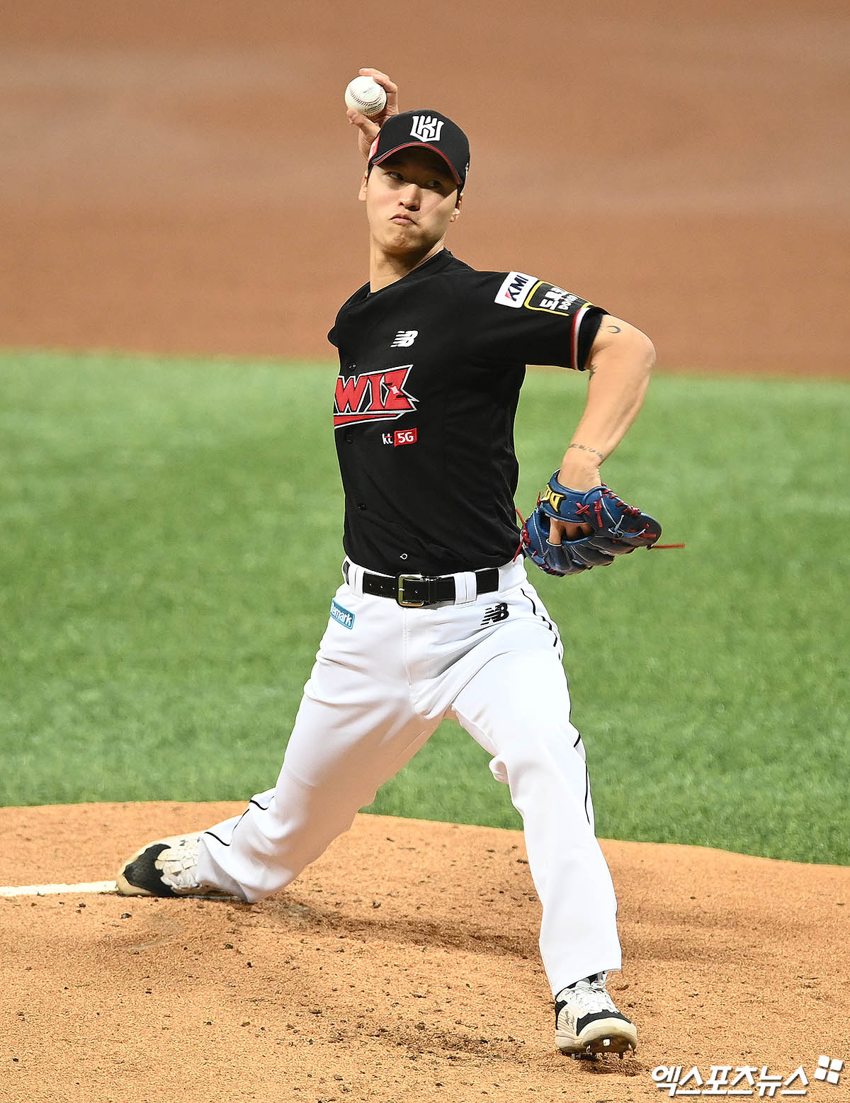 (엑스포츠뉴스 고척, 박지영 기자) 12일 오후 서울 구로구 고척스카이돔에서 열린 '2021 신한은행 SOL KBO리그' KT 위즈와 키움 히어로즈의 경기, 1회말 KT 선발투수 엄상백이 역투하고 있다.