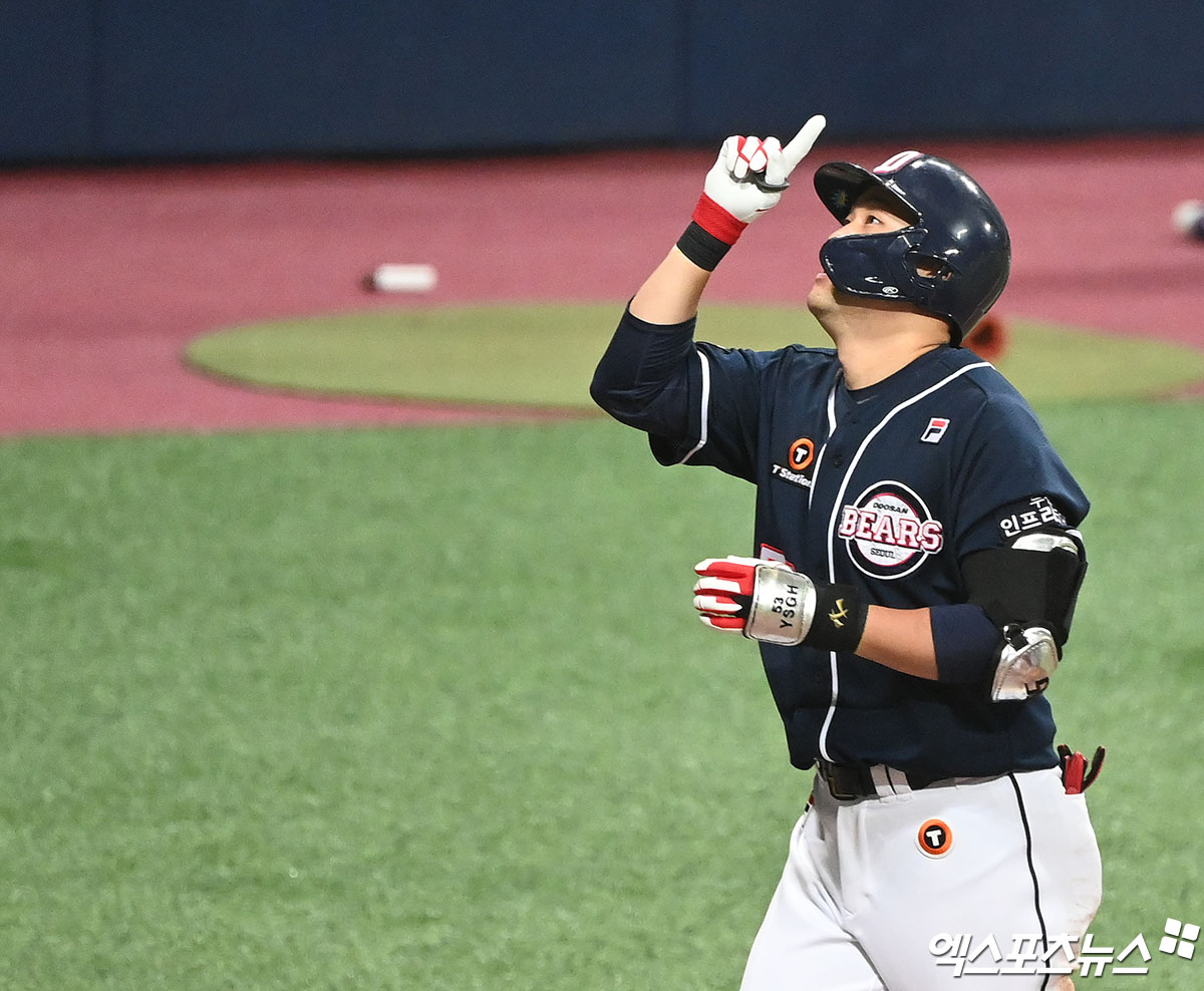 (엑스포츠뉴스 고척, 김한준 기자) 13일 오후 서울 구로구 고척스카이돔에서 열린 '2021 신한은행 SOL KBO리그' 두산 베어스와 키움 히어로즈의 경기, 7회초 무사 1,2루 두산 양석환이 스리런 홈런을 날린 후 세리머니를 하고 있다.