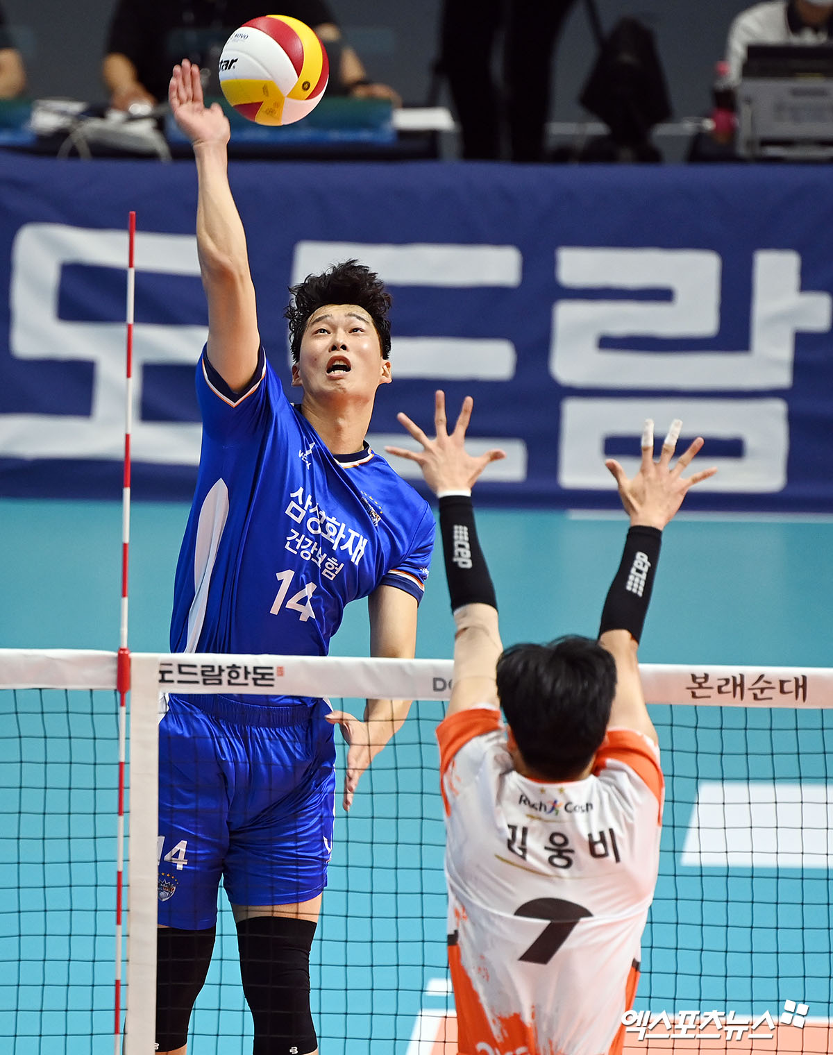(엑스포츠뉴스 의정부, 김한준 기자) 14일 오후 경기도 의정부실내체육관에서 열린 ‘2021 의정부·도드람컵 프로배구대회’ OK금융그룹과 삼성화재의 남자부 경기, 삼성화재 정수용이 공격을 시도하고 있다.
