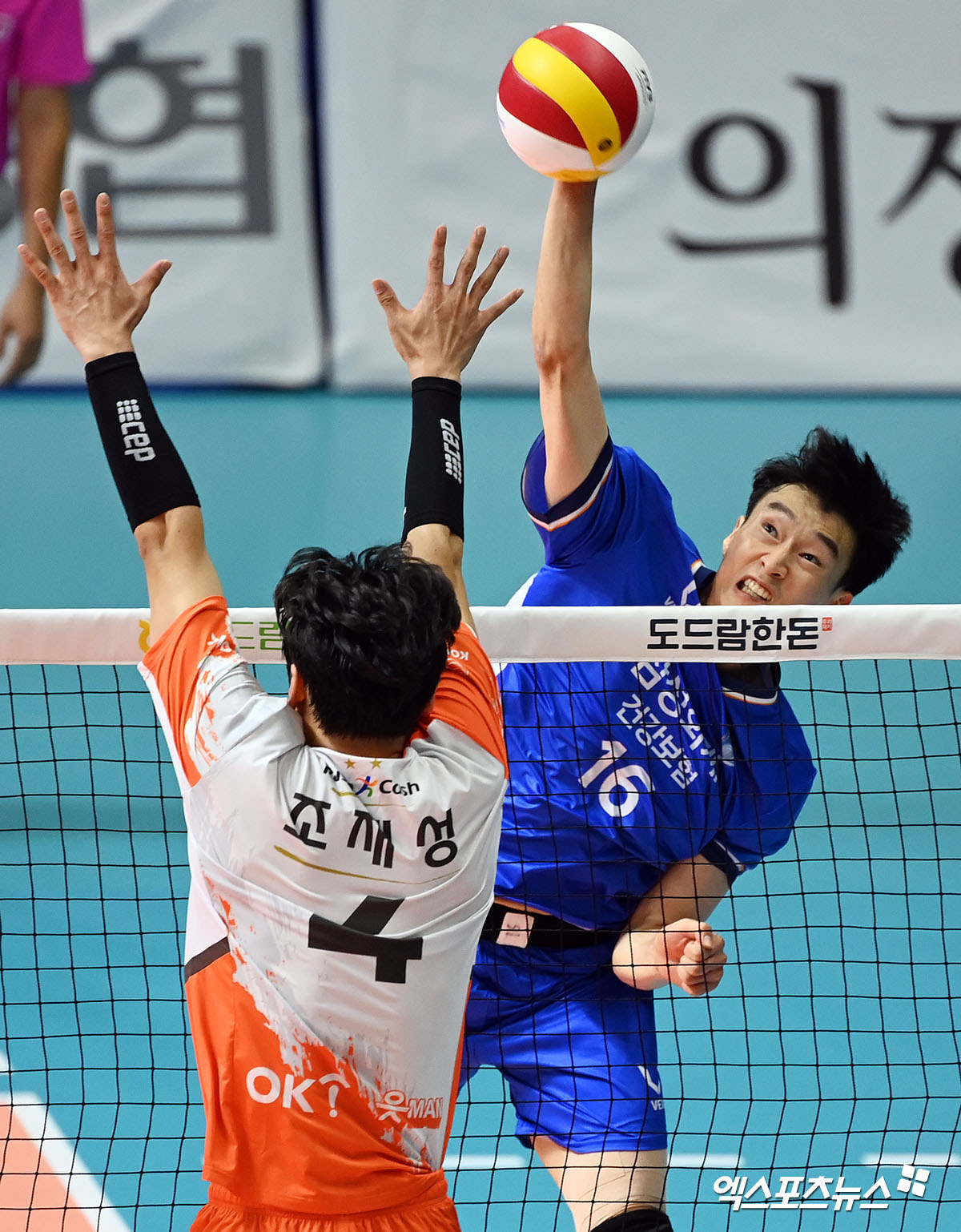 (엑스포츠뉴스 의정부, 김한준 기자) 14일 오후 경기도 의정부실내체육관에서 열린 ‘2021 의정부·도드람컵 프로배구대회’ OK금융그룹과 삼성화재의 남자부 경기, 삼성화재 정성규가 공격을 시도하고 있다.