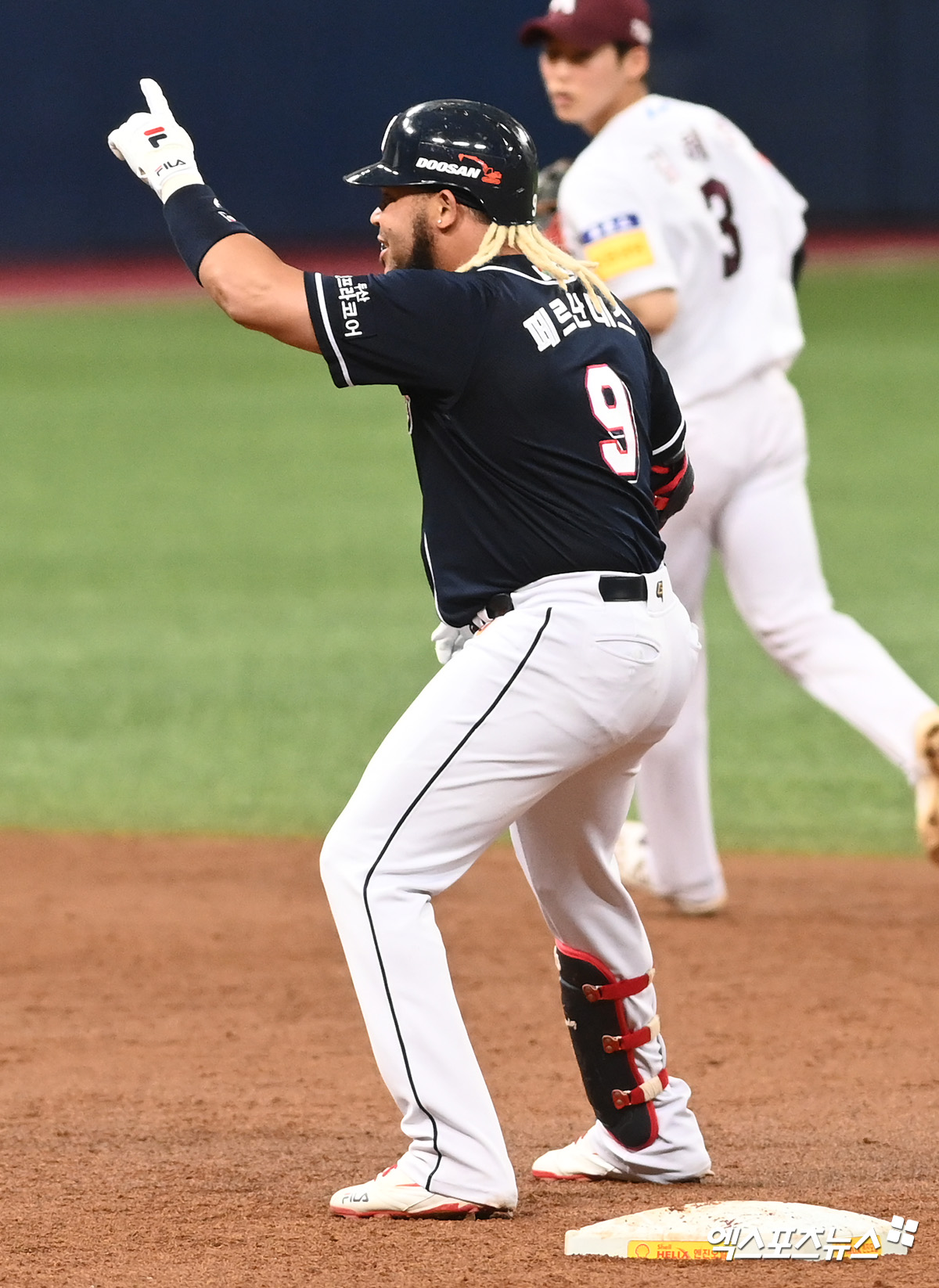 (엑스포츠뉴스 고척, 고아라 기자) 14일 오후 서울 구로구 고척스카이돔에서 열린 '2021 신한은행 SOL KBO리그' 두산 베어스와 키움 히어로즈의 경기, 3회초 두산 페르난데스가 2루타를 날린 뒤 세리머니를 하고 있다.
