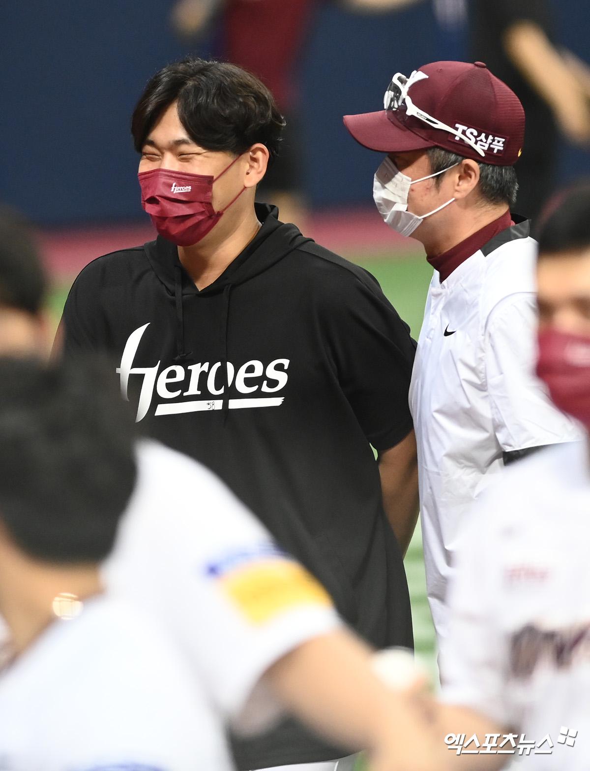 이날 경기에서 승리투수가 된 키움 정찬헌이 홍원기 감독의 축하를 받고 있다.