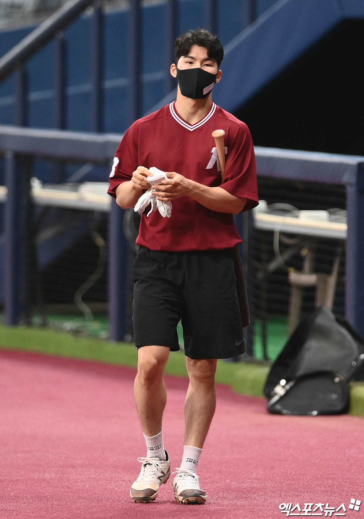(엑스포츠뉴스 고척, 박지영 기자) 26일 오후 서울 구로구 고척스카이돔에서 열리는 '2021 신한은행 SOL KBO리그' 한화 이글스와 키움 히어로즈의 경기에 앞서 키움 김혜성이 타격 훈련을 위해 그라운드로 나서고 있다.