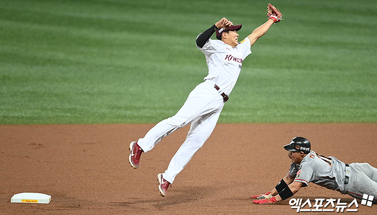 (엑스포츠뉴스 고척, 박지영 기자) 26일 오후 서울 구로구 고척스카이돔에서 열린 '2021 신한은행 SOL KBO리그' 한화 이글스와 키움 히어로즈의 경기, 1회초 2사 1루 한화 김태연 타석 때 1루주자 하주석이 2루로 도루 시도하고 있다. 키움 2루수는 송성문.