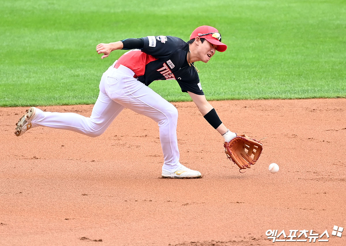 (엑스포츠뉴스 잠실, 김한준 기자) 1일 오후 서울 송파구 잠실야구장에서 열린 '2021 신한은행 SOL KBO리그' KIA 타이거즈와 두산 베어스의 더블헤더 1차전 경기, 1회말 무사 1,2루 KIA 박찬호가 두산 박건우의 타구를 쫓아가고 있다.
