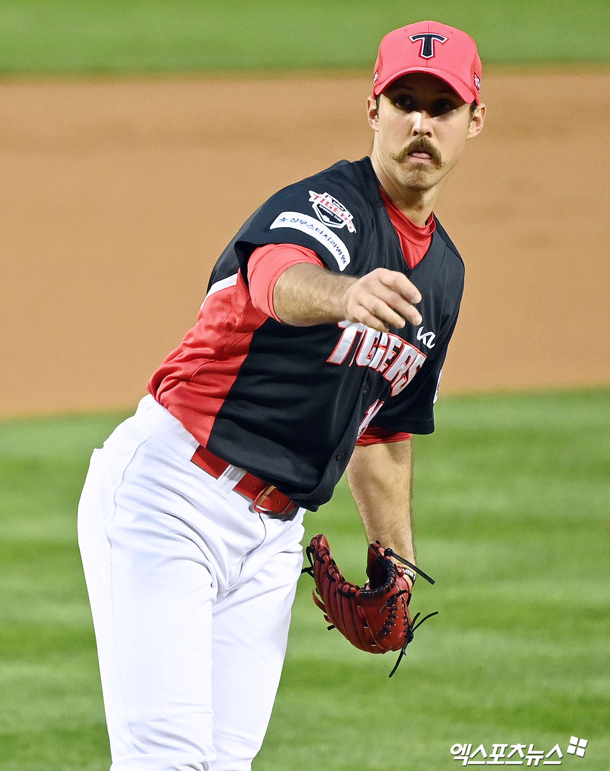 ​​​​​​​(엑스포츠뉴스 잠실, 김한준 기자) 1일 오후 서울 송파구 잠실야구장에서 열린 '2021 신한은행 SOL KBO리그' KIA 타이거즈와 두산 베어스의 더블헤더 2차전 경기, 1회말 KIA 선발투수 멩덴이 공을 힘차게 던지고 있다.