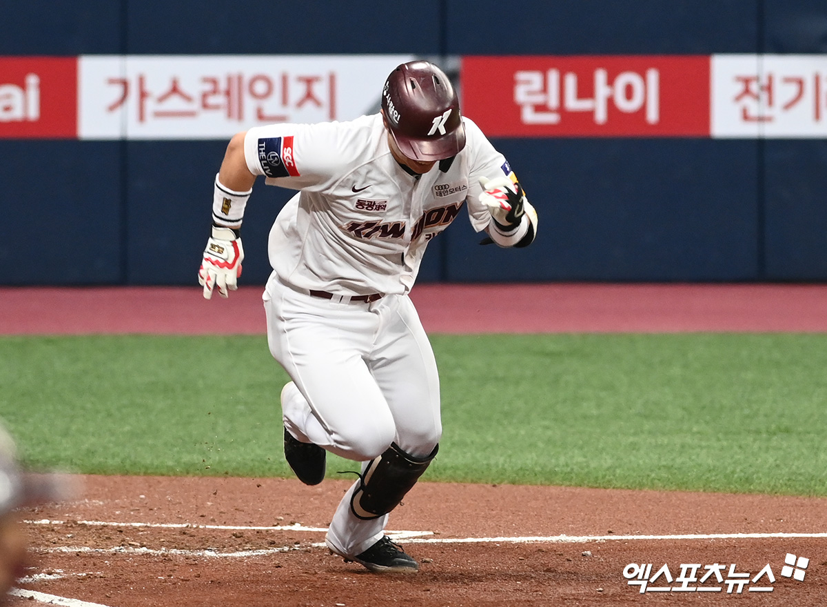 (엑스포츠뉴스 고척, 고아라 기자) 3일 오후 서울 구로구 고척스카이돔에서 열린 '2021 신한은행 SOL KBO리그' KT 위즈와 키움 히어로즈의 경기, 3회말 2사 2,3루 키움 박동원이 1루를 향해 달리고 있다.