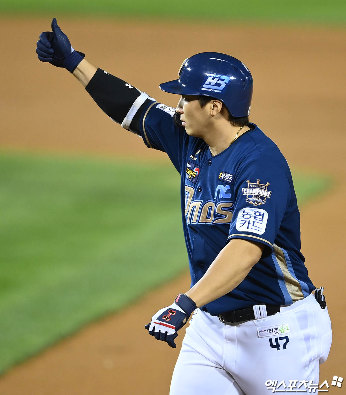 (엑스포츠뉴스 잠실, 박지영 기자) 3일 오후 서울 송파구 잠실야구장에서 열린 '2021 신한은행 SOL KBO리그' NC 다이노스와 LG 트윈스의 경기, 7회초 2사 2,3루 NC 나성범이 동점 2타점 적시타를 때려내고 있다.